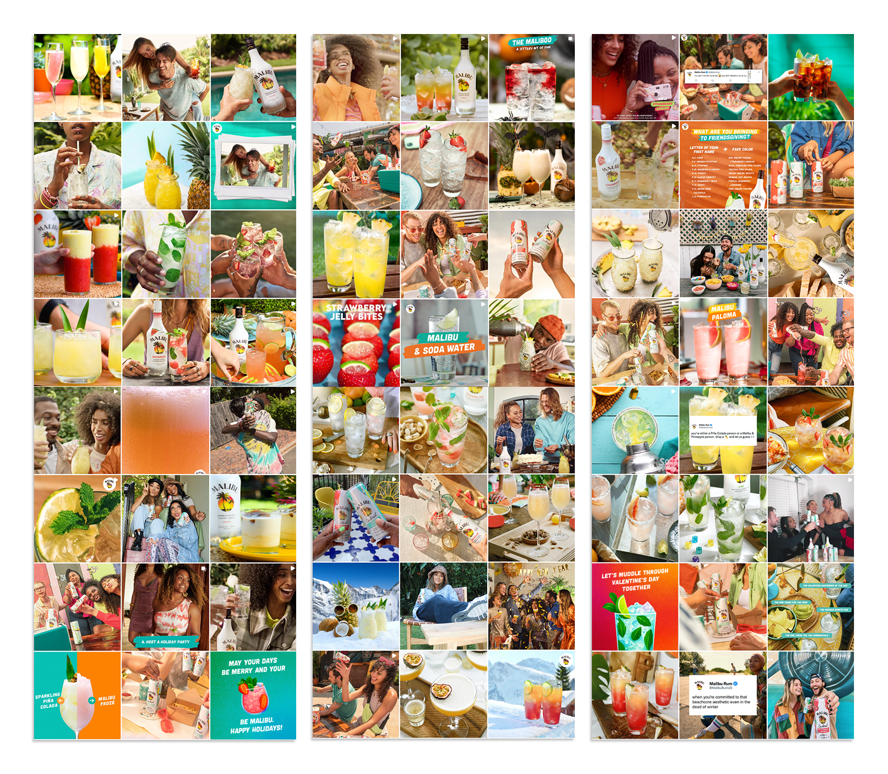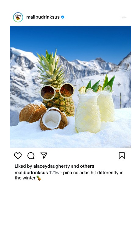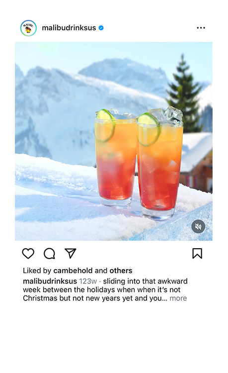 Developed nine months of social content for Malibu Rum post-COVID, covering fall, winter, and spring. The theme embraced the weird yet wonderful feeling of getting back together after so much time apart, celebrating those awkward post-pandemic reunion moments with humor and warmth while letting the fun shine through.